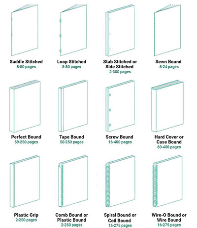 To make a book, we need to compile printed pages and bind them together. There are a variety of binding methods that can be used for combining separate pages into a finished book. The type of binding may be limited by the paper size and number of pages to be bound. The images below illustrate some of the more popular binding methods used in the printing industry. At AzePrint, we do not cater to all of the available binding methods but just those few that is highlighted.